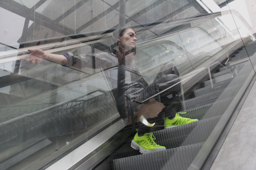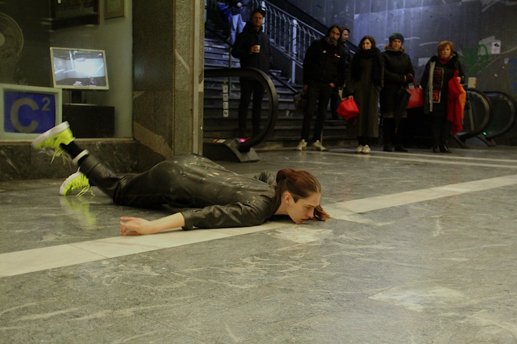 Artist’s performative body enters problematic public space, structures of changes. She aims to build compositions open to transformation.