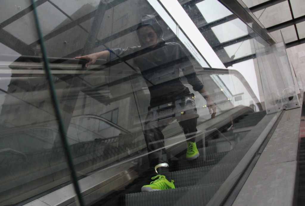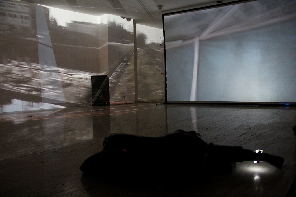 The accompanied sound was gathered with field recordings at the building sites, intertwined with electromagnetic sounds from Cirkulacija 2. It will be used as a live composition element through sensors responding to the movement.