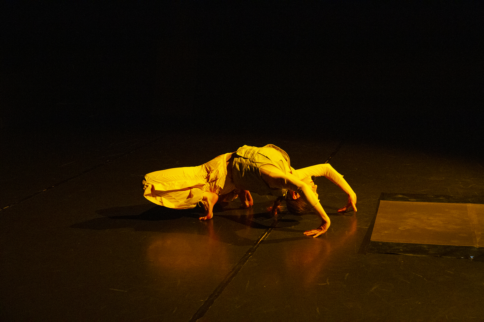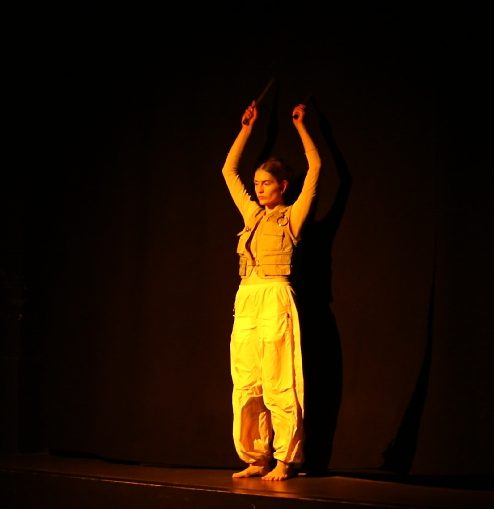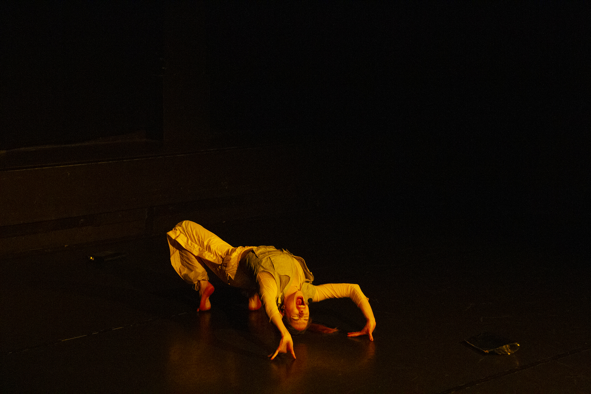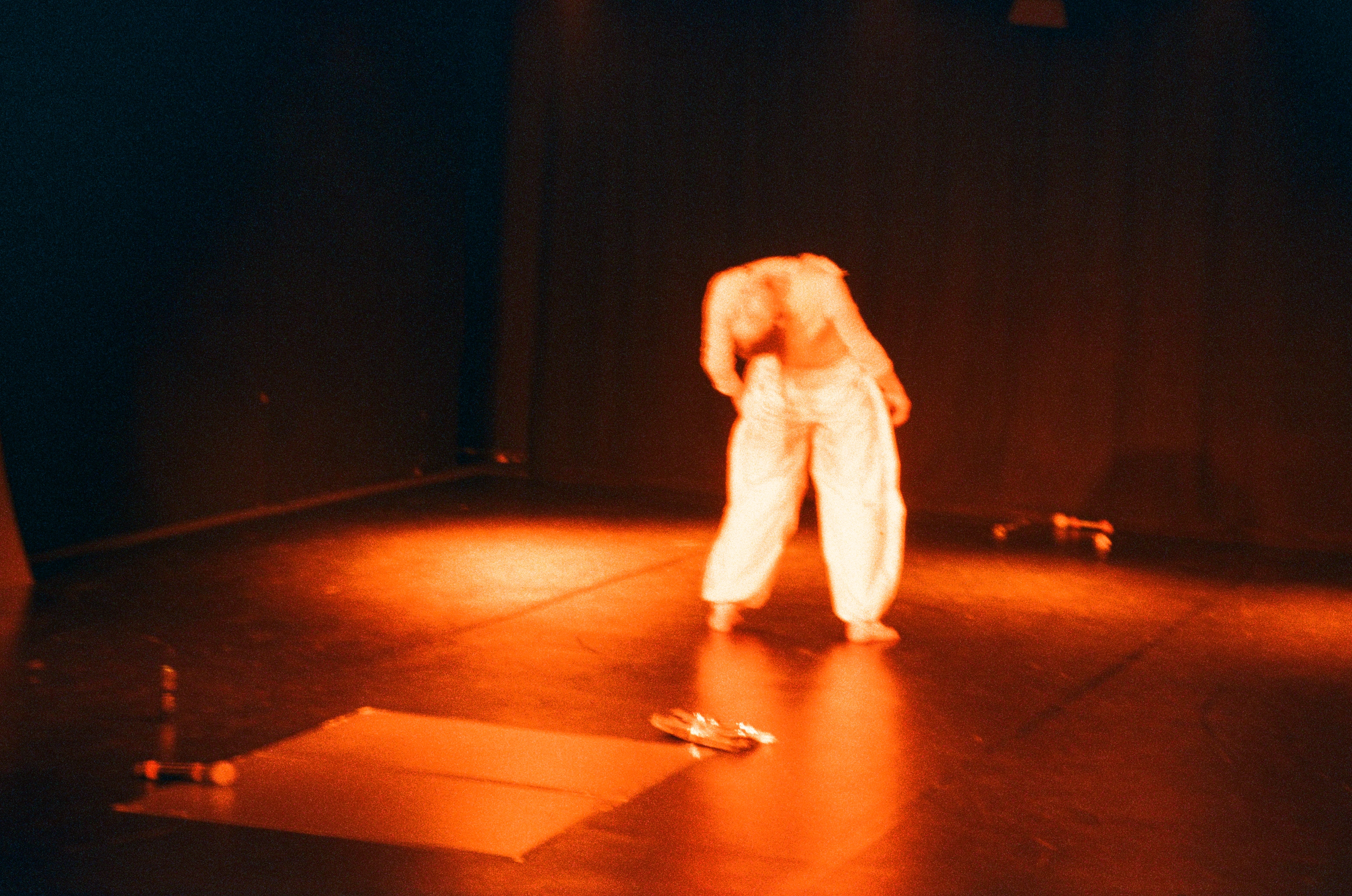 The piece was divided into five sections, constructing diverse ambiences and sounds, created simultaneously with the movement. They presented archives of difficult events from the past years spent in Berlin, from the lack of living and creating space to violent environments that lead to internalised discomfort. The past events are therefore changed into performative material, opening an insight into artists living conditions that might be a common story of many inhabitants.